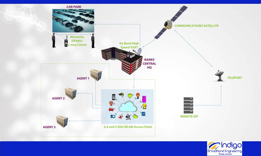 Indigo Broadband provides a range of services to the banking industry from VSAT back-up for terrestrial connectivity, to inter-branch wireless connectivity with in-country Head Offices across cities and towns, VSAT connectivity linking rural branches to in-country Head Office, and VSAT and fibre connectivity between in-country operations and International offices.
